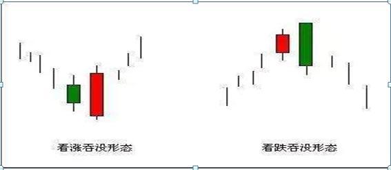 区别于之前的锤子线和上吊线,吞没形态是由两根K线组成的复合形态。在一个下降的趋势线中,出现了一根坚挺的阳线,完全的吞没了它前面的阴线,此类形态称为看涨吞没形态;相反在一个上升的趋势中,出现了一根阴线,完全的吞没了它前面的阳线,此类形态我们称之为看跌吞没形态