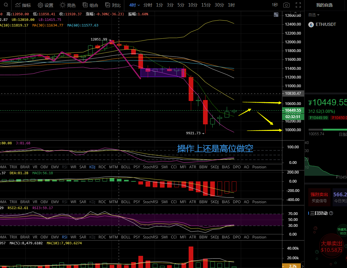 BTC行情分析:今日白盘大饼小幅度拉升已至10450一线附近,从四小时线看,布林带张口,币价缓慢上穿布林带下轨运行在布林带中下轨区域。MACD快慢线形成死叉在零轴下方运行,红色动能量持续缩量,说明多头开始发力,kdj三线形成金叉。短期内还是有所反弹。上方压力位10600,下方支撑位10000。操作上以高位做空为主。
