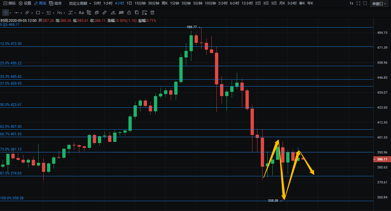 以太坊四小时级别来看价格昨日插针至358美金反弹,行情于下轨上方运行。布林带呈张口运行,短期来看任有下跌风险,各均线压制价格走低。幅图指标MACD于0轴下方死叉运行,KDJ指标三线向上散发,RSI指标三线平缓运行。上方压力位400-390,下方支撑位380。操作上高空为主,低多为辅。
