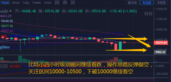综上:从盘面来看,小时线级别短期行情幅度有反弹趋势,大趋势技术面依旧偏向空头。若币价能够企稳10350上方,则有进一步上探可能。反之,若币价反弹无力,则关注下方支撑10000附近,行情反弹关注上方10400-10500压制。晚间操作思路继续反弹做空。操作建议高空为主,低多为辅。