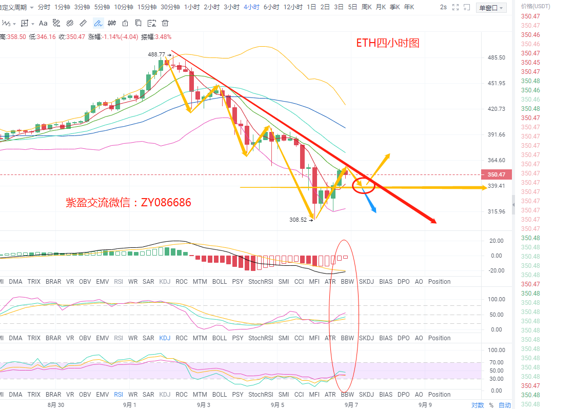 以太坊四小时级别来看,布林带通道呈收口状态,经过白盘多头的努力币价突破下轨企稳上方,运行在中轨下方附近,均线方面,5日均线向上勾头,币价在其上方沿10日均线移动,30日均线保持向下,指标方面,MACD快慢线在0轴下方收口运行,红色动能柱明显缩量,KDJ三线向上发散,RSI在50下方拐头向下运行,综合来看白盘整个走势是宽幅震荡上行的,晚间很大概率会回落,操作思路不变还是高空为主,短期关注上方阻力360,下方340支撑。