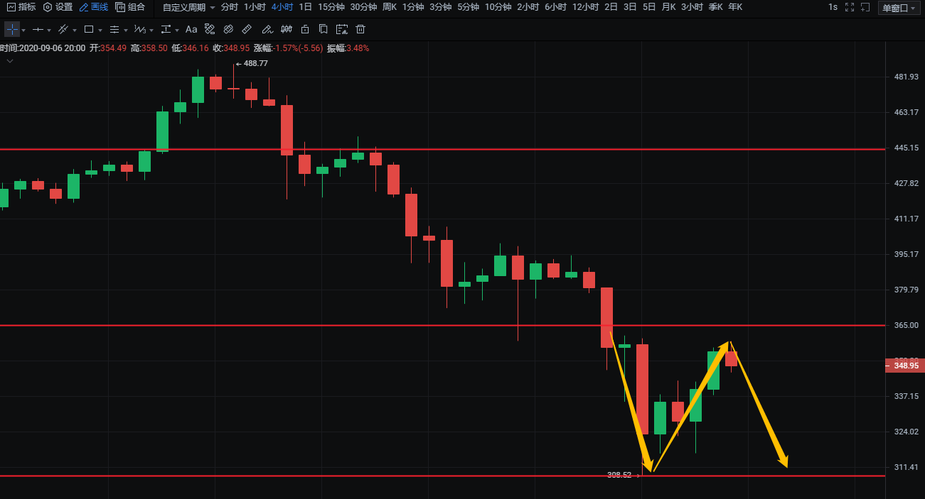 1:350-355附近空,止损5个点,目标345-340