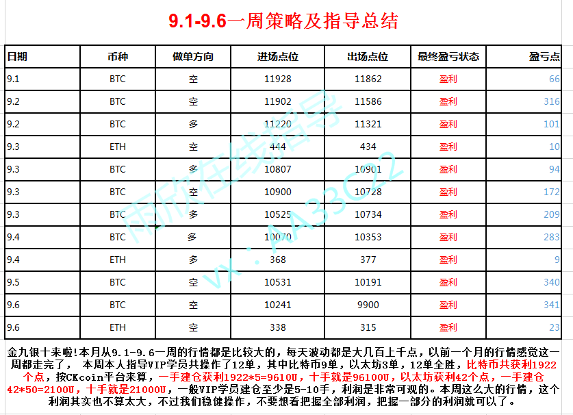 上周本人指导VIP学员共操作了12单,其中比特币9单,以太坊3单,12单全胜,比特币共获利1922个点,按CKcoin平台来算,一手建仓获利1922*5=9610U,十手就是96100U,以太坊获利42个点,一手建仓42*50=2100U,十手就是21000U,一般VIP学员建仓至少是5-10手,利润是非常可观的。