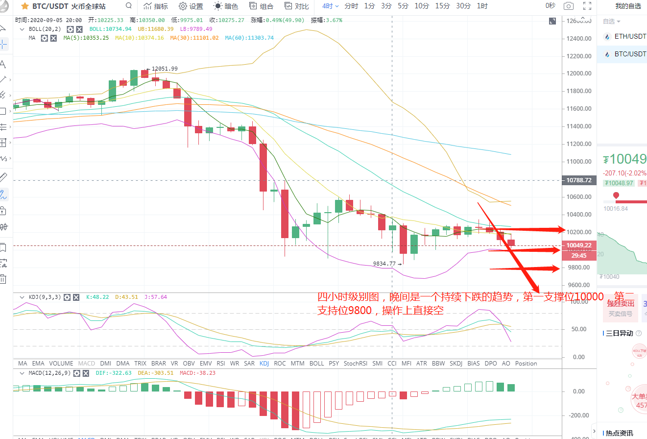BTC行情分析:四小图看,比特币多次向上探头,却遭受5日均线和10日均线双重压制,并未突破5日均线。多头开始乏力,空头占优,布林带缩口,k线运行在中下轨区域,KDJ三线呈死叉向下发散。从小时线看,k线突破布林带下轨达到10000大关后触底反弹,上下插针,附图MACD双线死叉,kdj三线死叉向下发散。预计晚间BTC会持续震荡下跌。上方压力位10200,下方第一支撑位10000,第二支撑位9800.