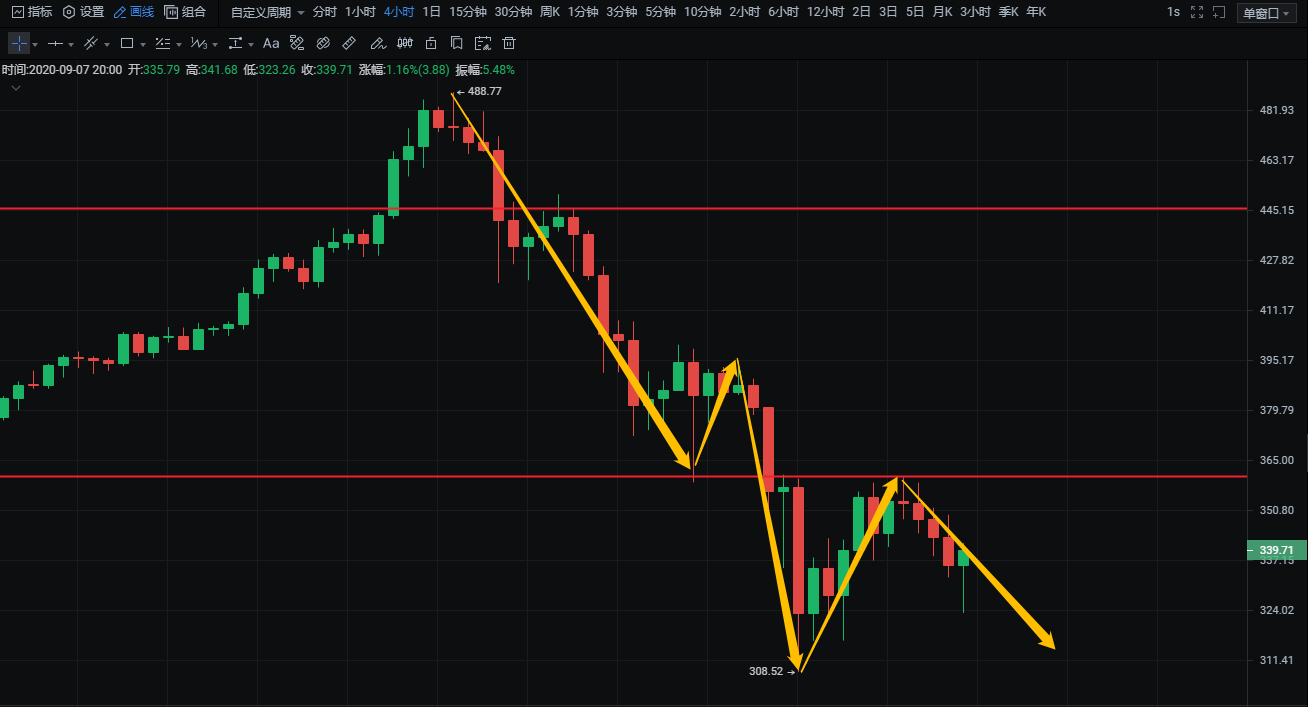 以太坊四小时级别来看价格连续向下插针,至下轨下方反弹,于下轨上方运行。布林带呈张口向下运行,短期来看下跌还未止步,各均线压制价格持续走低。幅图指标MACD于0轴下方死叉运行,KDJ指标三线向下散发,RSI指标三线拐头向下。上方压力位350,下方支撑位308。操作上高空为主,低多为辅。