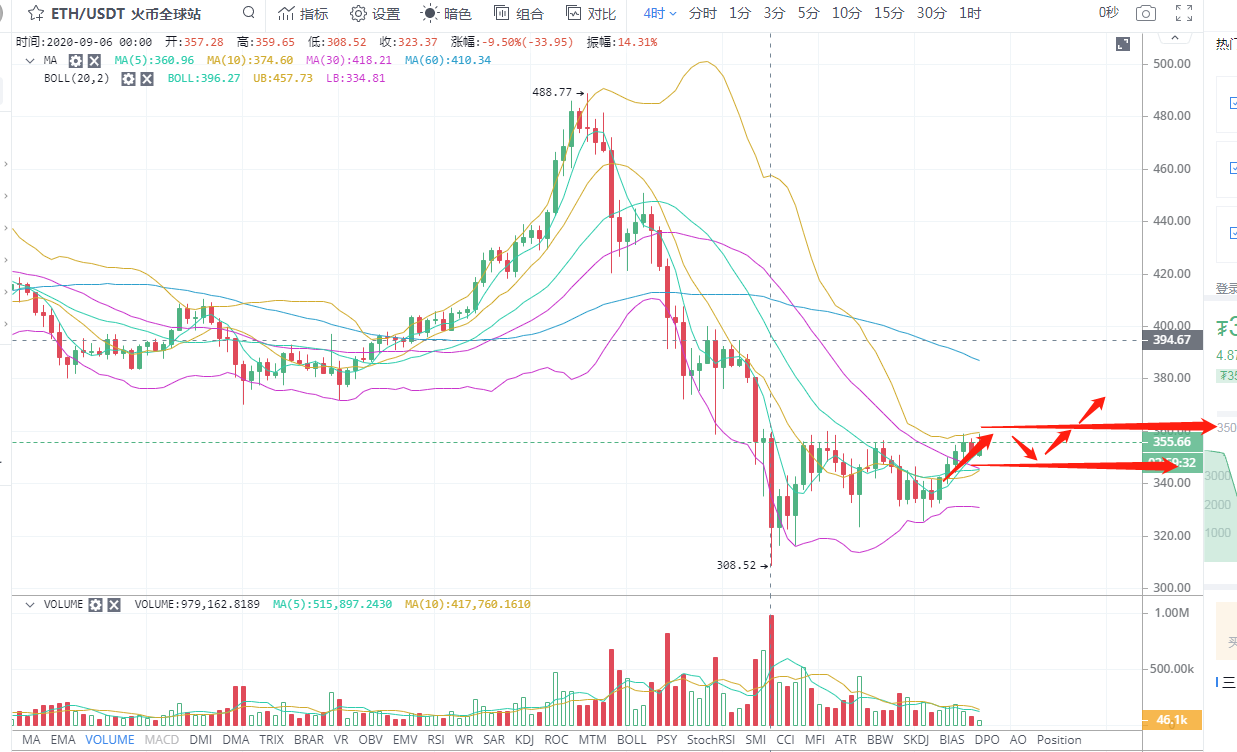 ETH行情分析:以太坊今天凌晨价格跟随上行358.9附近后开始回落,目前价格回踩350附近后跌势暂缓,维持在350附近整理。4小时图上看,布林带目前收口运行,5日均上穿10日均线。附图指标看,MACD金叉在零轴下方运行。整体来看,以太坊价格后市日内震荡上行。上方压力位360,下方支撑位345.操作上回调做多为主。