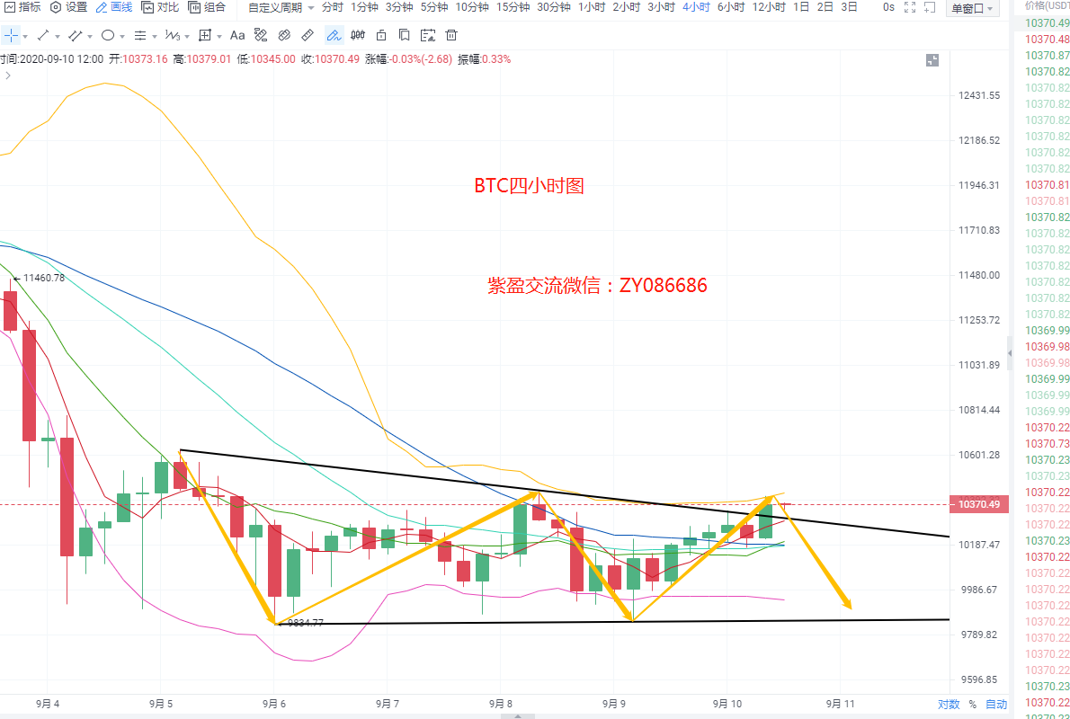 四小时级别来看,早间收线后的强拉上涨突破上方趋势线压制,可以看到多头量能有所增加,自9.4下跌以来,连续一个星期的时间币价都在10000美金徘徊,期间也是频频插针,但未能有效跌破10000下方,这对空头的消耗很大,布林带通道成开口状态,币价突破各均线以及中轨压制,来到上轨下方并承压上轨,均线方面5日均线以及10日均线保持上扬,30日均线走平,指标方面,MACD快慢线在0轴下方开口运行,多头柱二次放量,KDJ三线向上移动,RSI走平,综合来看,未突破日线级别10日均线压制就还是看震荡,上方阻力在10540,下方支撑10220,操作上高空低多即可