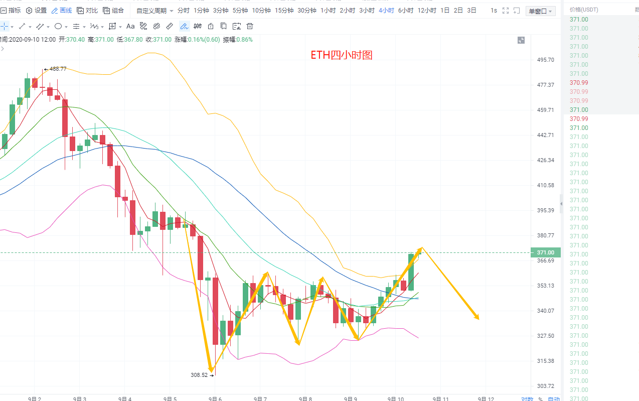 以太坊四小时级别来看,早间收线后大幅上涨20余点,突破上轨压制,目前布林带成开口状态,币价运行在上轨上方,均线方面币价突破各均线,下方5日均线与10日均线都已金叉向上运行,30日均线走平,MACD快慢线在0轴下方开口运行,多头柱二次放量,KDJ三线走平,RSI触及超买区拐头向下,综合来看,短期有回落需求,支撑350,阻力372,操作低多高空即可。