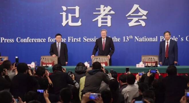 3月9日上午10时,十三届全国人大一次会议新闻中心在梅地亚中心多功能厅举行记者会,邀请中国人民银行行长周小川,副行长易纲,副行长、国家外汇管理局局长潘功胜就金融改革与发展相关问题回答中外记者提问。 中国人民银行行长周小川等答记者问(人民网记者 张