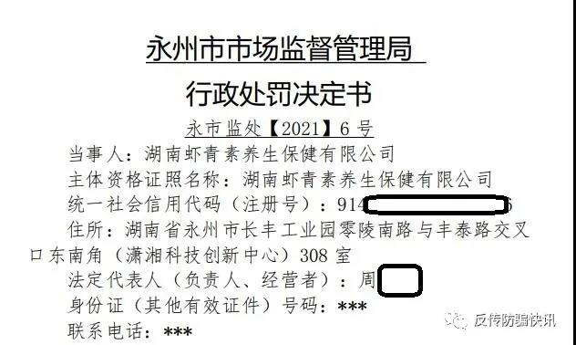 2021-05-09 永州破获“爱特网”传销案 虾青素公司被罚款100万元 4月8日,反传防骗快讯了解到,永州市市场监督管理局(以下简称:永州市市监局)破获“爱特网”传销案,其主体公司湖南虾青素养生保健有限公司(