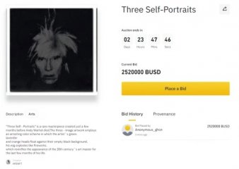 2021-06-25 安迪·沃霍尔全球首个NFT开拍被热捧,以252万美元迎开门红 6月24日,由币安、波场TRON、APENFT基金会联合举行的的"Genesis"主题拍卖会正式开启,作为最重要的拍品,安迪·沃霍尔的《三幅自画像》NFT作品在开拍不到5分钟,竞拍价已达252万美元。