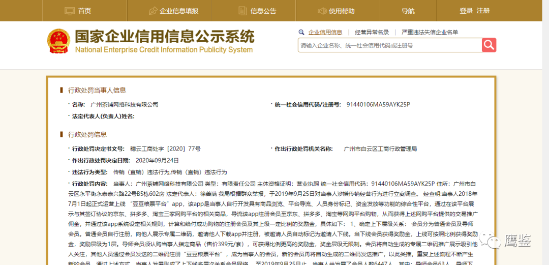 2021-05-09 “豆豆粮票平台”涉嫌传销 被工商局罚款70万元 1月12日,鹰鉴从企查查获悉,广州茶铺网络科技有限公司(下称:广州茶铺公司)因组织策划传销被罚款70万元。鹰鉴在处罚书上看到,2019年9月25日白云区工商局根
