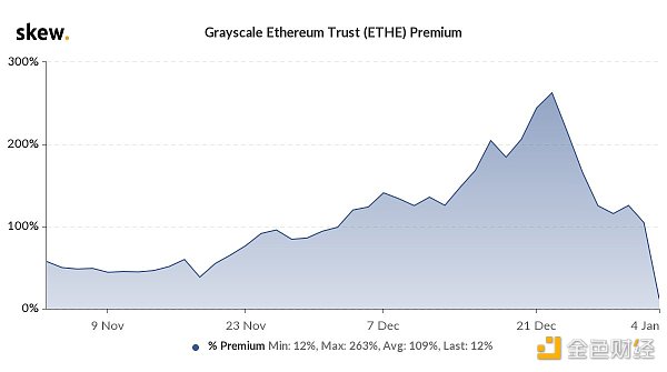2021-01-08 央妈对比特币才是真爱|ETH突破1100美元 但灰度ETH信托溢价率却跳水95% 1月5日,Skew数据显示,灰度ETH信托(ETHE)溢价率快速下跌,从两周前的250%左右跌至不到25%,创2个月以来的新低。吊诡的是,在ETH信托溢价暴跌的