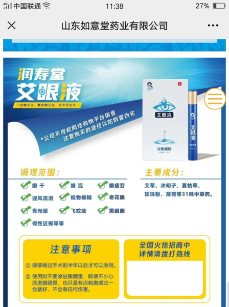 该公司除了艾灸液之外,还有一款明星产品“润寿堂艾眼液”。