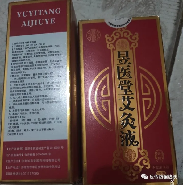 小锦用的是一款名为“昱医堂艾灸液”的产品。产品外包装上显示是鲁济械备20140008号,属于医疗器械产品备案。假中医宣称该产品可以做到真正内病外治、外病外治的透皮效果,对于颈椎病、肩周炎、腰间盘突出、风湿病、静脉曲张、脂肪瘤等,有着神奇的效果。