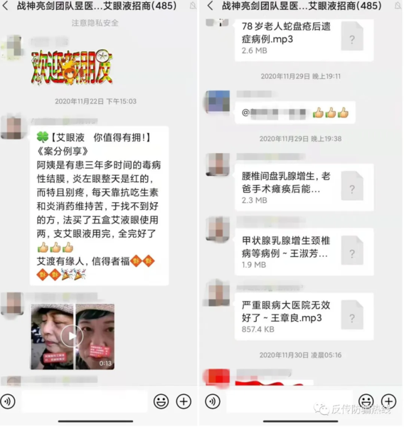 李旭反传销团队在国家药品监督管理局官网查到,“艾眼液”在医疗器械产品备案时显示的预期用途为“用于人体物理退热,体表面特定部位的降温,仅用于闭合性软组织。”而该团队市场推广人员在微信群和朋友圈却宣称可以调理眼干、眼涩、眼疲劳、迎风流泪、视物模糊、老花眼、青光眼、飞蚊症、黑眼圈、假性近视等等。加上经常在微信群进行授课,并有“受益人”现身说法,吸引了一大批求药心切、不明真相的普通消费者参与。而这显然也属于虚假、夸大宣传。