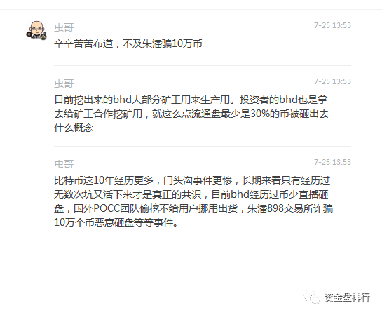 当时898还私吞了十万个BHD,然后转手去别的交易所恶意砸盘,当时BHD从6月底最高50刀,被砸到差不多20刀,作为BHD的布道者虫哥也在爱思媒体群回应朱潘的黑心交易所私吞用户币事件时说道:“辛辛苦苦布道,不及朱潘骗10万币”,