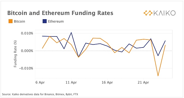 由于货币政策再度收紧以及对中国增长前景的担忧,比特币和以太坊融资回报在上周转为负值后,在周末重新设置为中性。我们绘制了四家资产服务平台(Binance, Bitmex, Bybit和FTX)的平均比特币和以太坊(联邦)基金回报。(联邦)基金回报被视为衡量市场情绪的一个指标,正的(联邦)基金回报表明更多的交易者正在进入多头头寸,看涨需求强劲(反之亦然)。尽管过去几天有所回升,但比特币永续期货融资回报的跌幅超过了以太坊上周的跌幅。自去年12月以来,这两种资产的总体融资回报一直处于稳步下降的趋势。