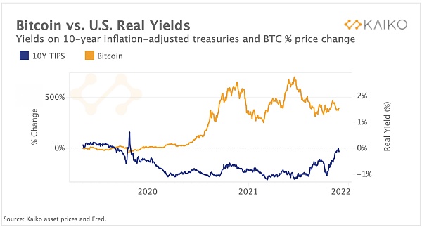 然而,如果我们使用40年来最高的消费者物价指数8.5%作为实际收益率的调整,而不是通膨保值债券(TIPS)收益率,那么实际收益率仍然是-5.5%。人们可能会认为,这表明在现实世界中仍存在大量投资风险资产的动机,或者这仅仅意味着美联储仍有更大的加息空间。不过,实际收益率看来只会在短期内上升,因为美联储似乎将抑制通胀置于促进经济增长之上。(原文作者:Kaiko 金色财经编译)
