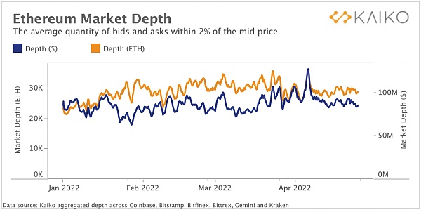 根据最近的链上数据,资产服务平台持有的以太坊的数量处于2018年以来的最低水平。尽管外汇大量流出,但自2022年初以来,以太坊-美元交易对市场深度一直保持稳定。Kaiko的市场深度数据是从中间价的2%内的投标和要价的总数。上面,我们绘制了以以太坊(橙色)和美元(蓝色)计价的总市场深度图,可以观察到以太坊的原始数量和美元价值在流动性最强的资产服务平台保持稳定。