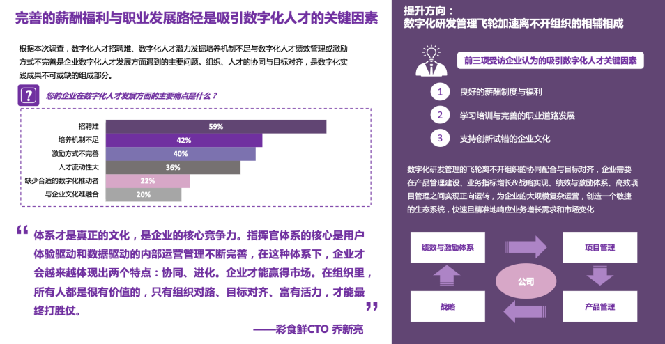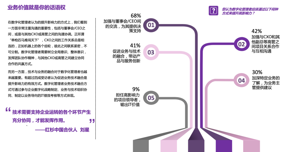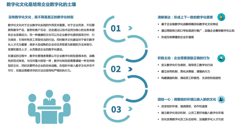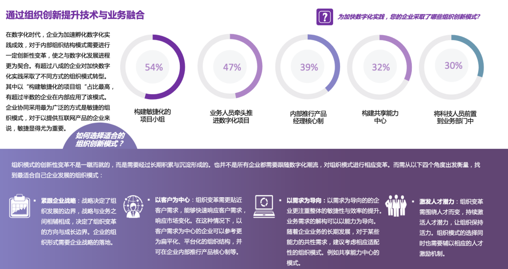 随着企业数字化进程的推进,数字化管理者的角色越来越重要,技术所发挥的影响力也逐步提升。数字化需要业务与技术双方的深入参与,如何通过更“敏捷”的组织模式和配套机制使业务和技术目标一致,实现高效协同是企业需要解决的一大问题。同时,数字化文化是培育企业数字化的土壤,也是构建企业协同组织必不可少的一环。