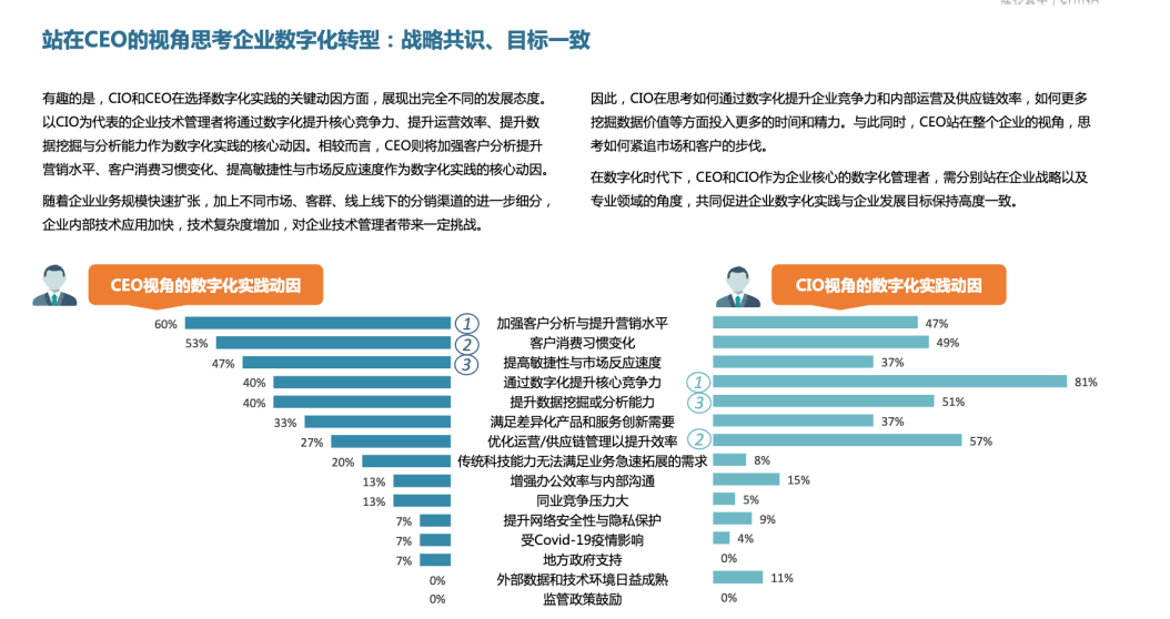 CEO和CIO作为企业核心的数字化管理者,需分别站在企业战略以及专业领域的角度,共同促进企业数字化实践与企业发展目标保持高度一致。