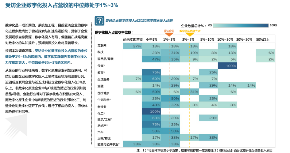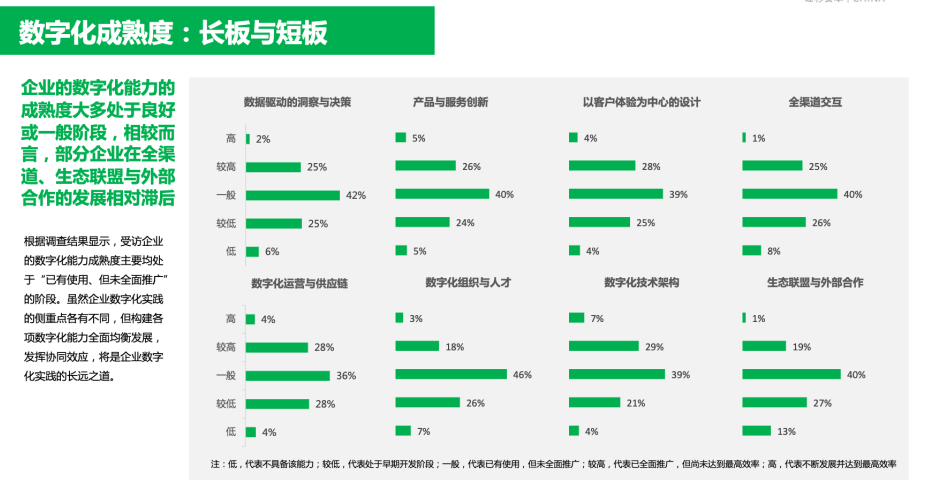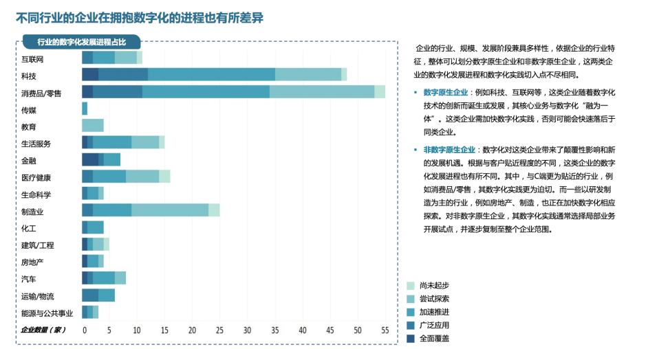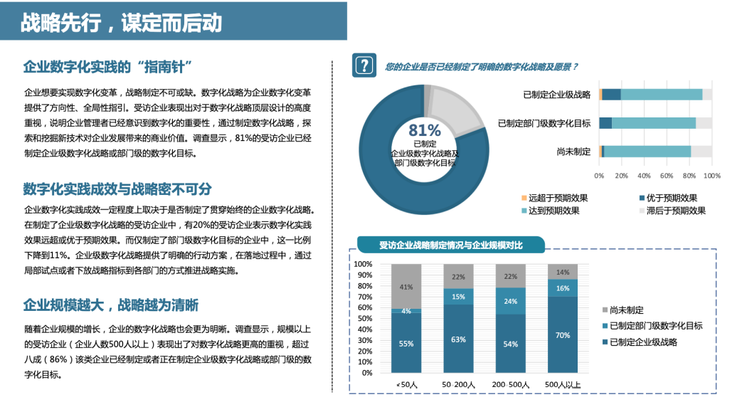 数字化发展的前期,大型企业是主要参与者,其更偏好自上而下地系统改革,基于业务流程梳理进行全面的数字化部署,因此其对于企业级数字化战略的制定也更为迫切。随着数字化进一步发展,中小企业逐步从观望者转化为参与者,但他们往往不具备足够的资源与技术进行全面改进,因此他们更多选择从业务部门出发,针对明确的需求和痛点,利用数字技术解决问题。