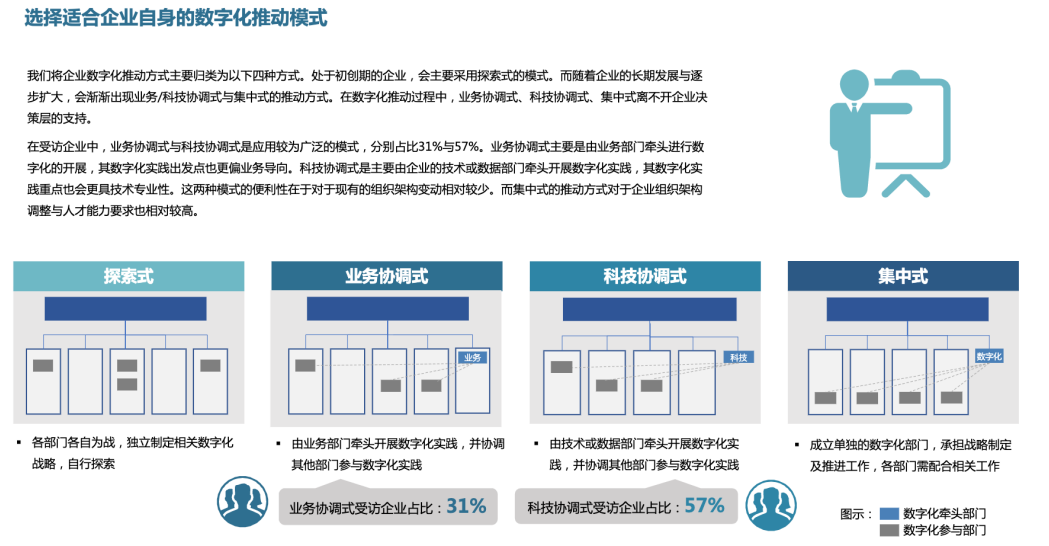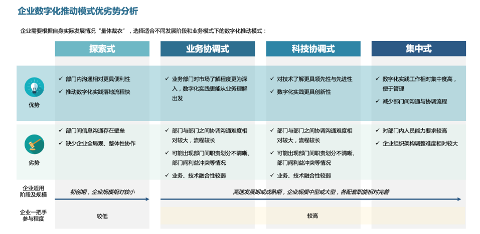 企业需要根据自身实际发展情况“量体裁衣”,选择适合不同发展阶段和业务模式下的数字化推动模式。
