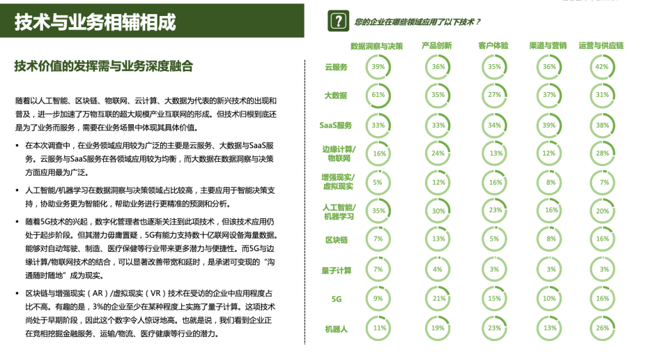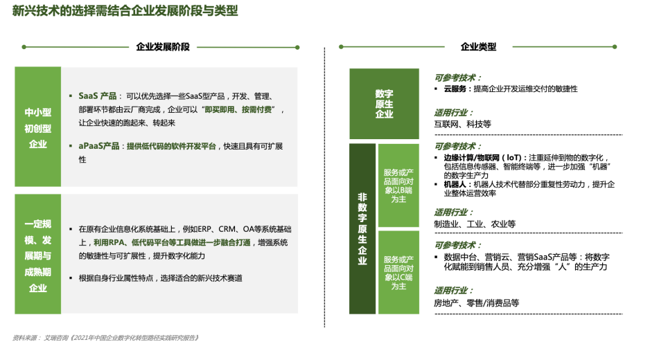 以人工智能、区块链、物联网、云计算、大数据为代表的新兴技术的出现和普及,进一步加速了万物互联的超大规模产业互联网的形成。但技术归根到底还是为了业务而服务,需要在业务场景中体现其具体价值。面对不同发展阶段、不同应用场景的企业数字化需求,数字化领导者们应该为自己的企业匹配什么样的数字技术?