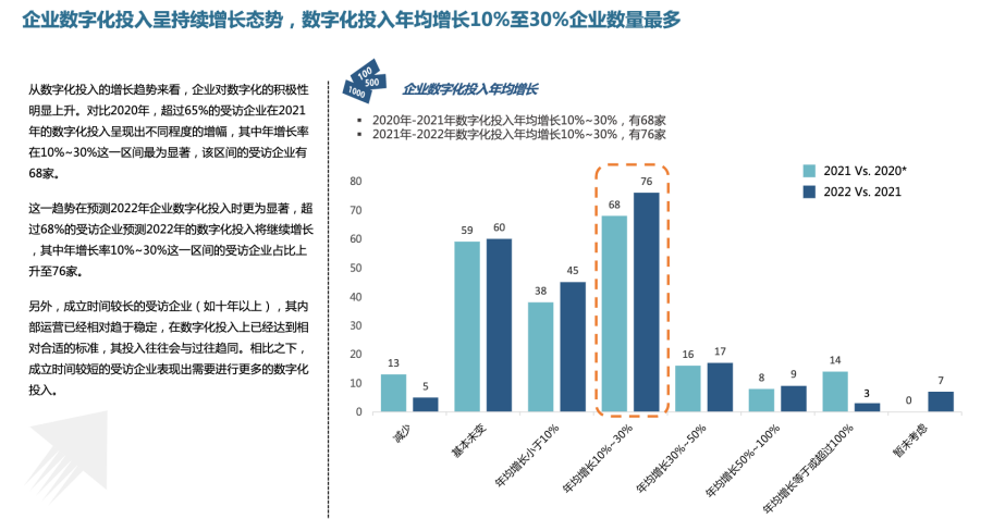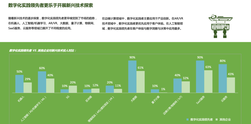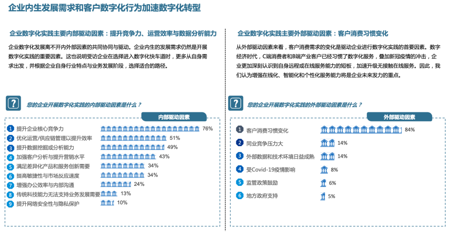 报告显示,数字化已经成为企业的“必修课”,96%的受访企业表示已开展了数字化实践,并且超过六成的受访者希望增加数字化投入。从数字化的动因来看,客户消费习惯与需求变化成为企业进行数字化的直接外因,而提升自身核心竞争优势则成为了企业进行数字化的核心驱动力。