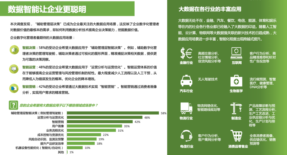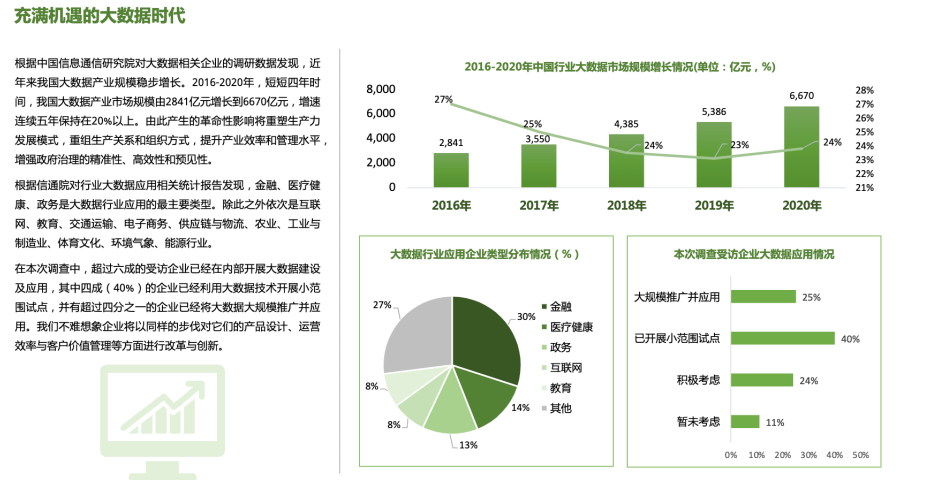 大数据大数据市场依旧热门,虽然只有25%的企业大规模推广并应用了大数据技术,但其在“局部试点”中占比最高,有40%的企业已开展大数据的小规模试点。与此同时,企业主要将其应用于数据驱动的洞察与决策。