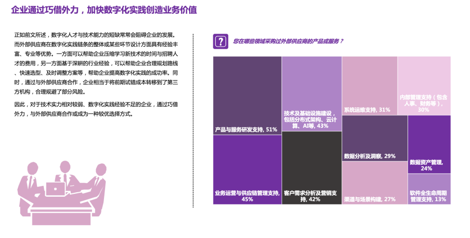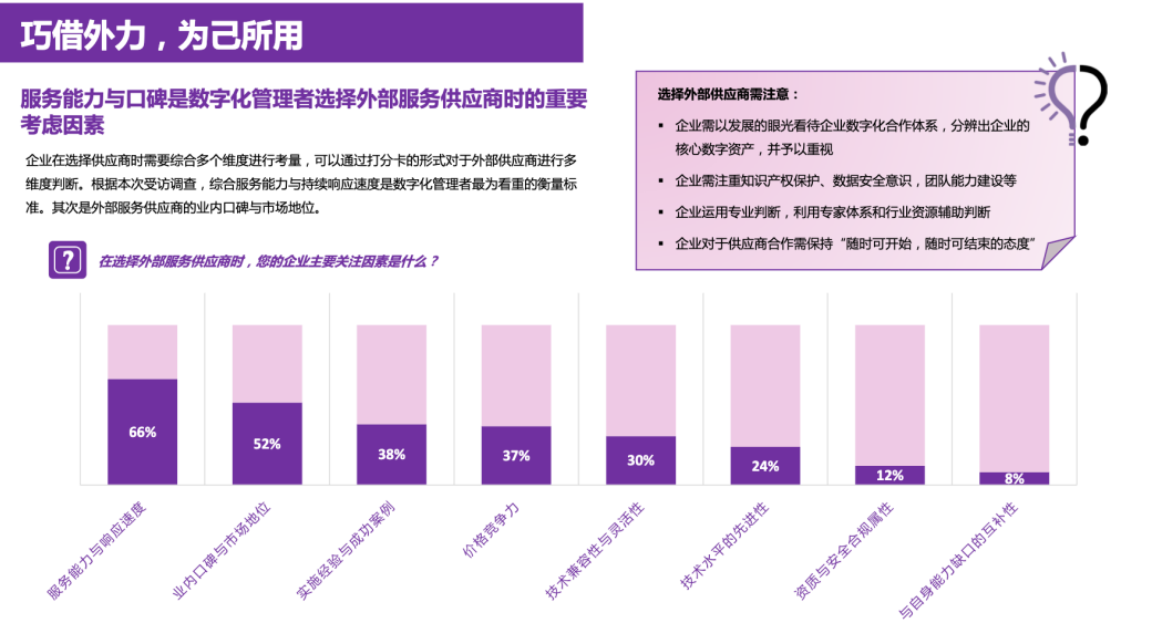 当前,数字化人才与技术能力的短缺常常会阻碍企业的发展。而外部供应商在数字化时间链条的整体或某些环节设计方面具有经验丰富、专业等优势。因此,对于技术实力相对较弱、数字化实践经验不足的企业,通过巧借外力与供应商合作或成为一种较优选择方式。