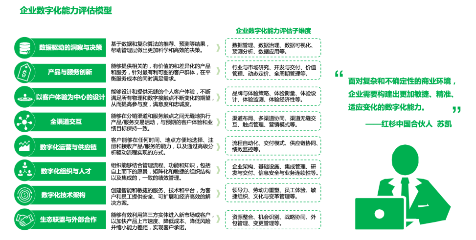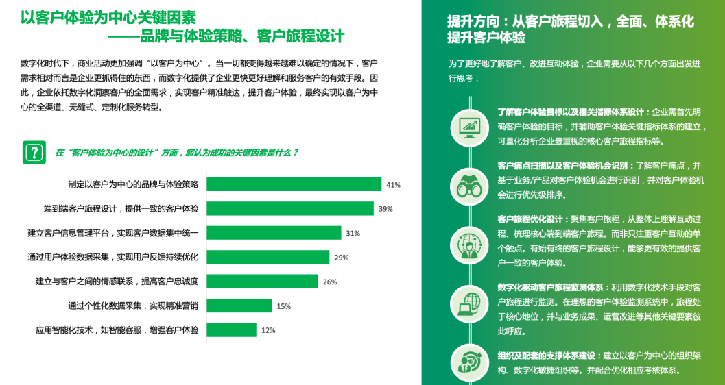 数字化时代下,商业活动更加强调“以客户为中心”。在一切都变得越来越难以确定的情况下,客户需求相对而言是企业更抓得住的东西,而数字化提供了企业更快更好理解和服务客户的有效手段。因此,企业依托数字化洞察客户的全面需求,实现客户精准触达,提升客户体验,最终实现以客户为中心的全渠道、无缝式、定制化服务转型。