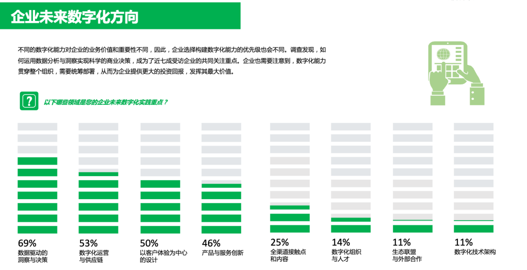 数据的重要性毋庸置疑,近七成的受访者表示如何通过数据驱动业务洞察与决策是其未来的数字化重点。然而数据治理能力不足已成为阻碍企业数据应用的主要因素。因此,如何建立科学开放的数据资产管理与运营体系是所有企业都需要考虑的问题。此外,数据安全是构建客户信任的基础,相应安全保障工作也需同步开展。