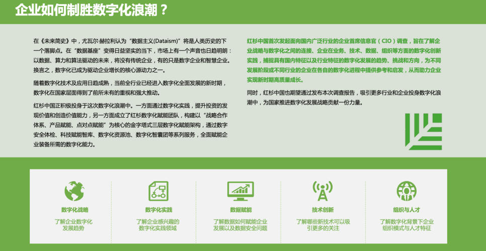 企业迈向数字化已经是不可逆转的趋势。作为企业数字化的“舵手”,CIO群体在这一重大转型中碰到了一系列全新挑战,同时留下了大量值得思考和研究的话题。红杉的这份《企业数字化指南》以“From CIO、To CIO、For CIO”为理念,从宏观的战略制定到实践中的数据治理、技术实现、组织协同等各个维度对企业数字化进行了全面梳理,为CEO、CIO和其他企业数字化管理者提供了一份系统的操作指南。