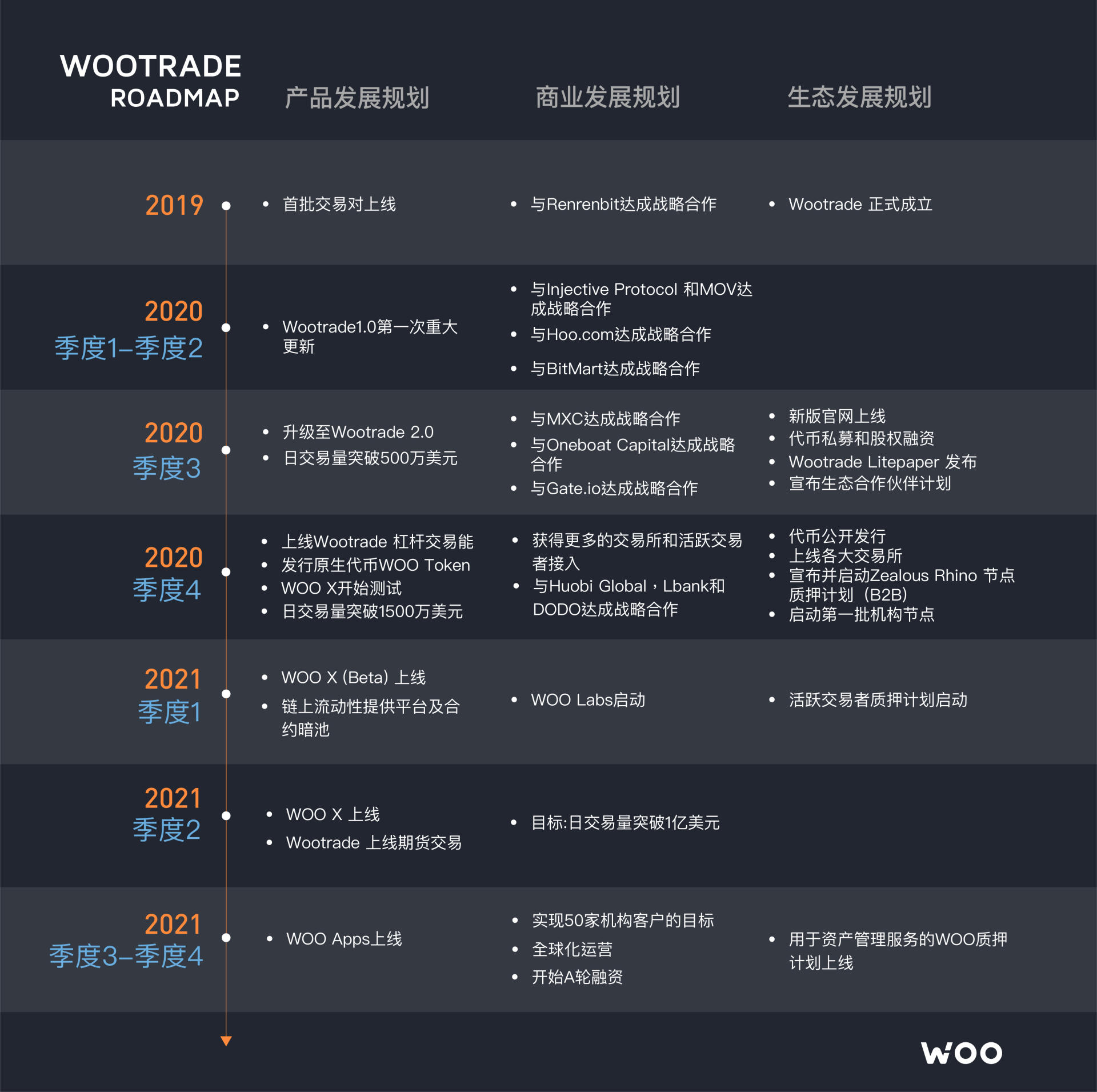 采薇:WOOTRADE从2020年初至今,已经稳定运行了1年,并在2020年7月份成功升级至2.0版本。商務拓展以交易所為主,而升级之后,我们有能力接入超过200家交易所和机构客户。在新的版本上系统可扩展性大幅提高,KronosResearch订单流交易策略将上线,打造内部流动性池。我们已经上线杠杆交易功能,这将大大提升用户的资金使用情况,方便用户在我们这里进行更大量的交易。除此之外,我们也有计划在今年年底开通合约的交易暗池,这也将增加我们客户的种类。目前Wootrade官方网站上已经可以看到每天的Cefi交易量。我们近期会逐一为大家披露我们最新的合作进展。交易所客户在接入WOOTRADE之后,交易量增长了3.5倍,交易机构使用暗池进行对冲,节省了大量的手续费用,我们预计随着新功能的上线,WOOTRADE的交易量将呈指数级增长。