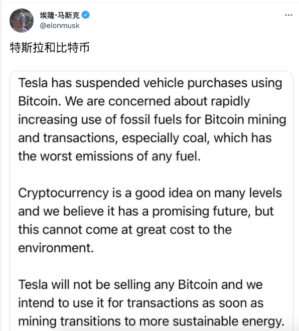 当马斯克又一次谈及比特币时,加密资产市场已经时过境迁。早前的5月13日,特斯拉宣布暂停接受比特币支付,马斯克在推特表示,「我们对比特币挖矿和交易中使用化石燃料的迅速增加感到担忧。」