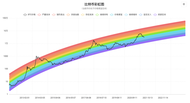 比特币彩虹图曾在价格高点提示「存在泡沫」