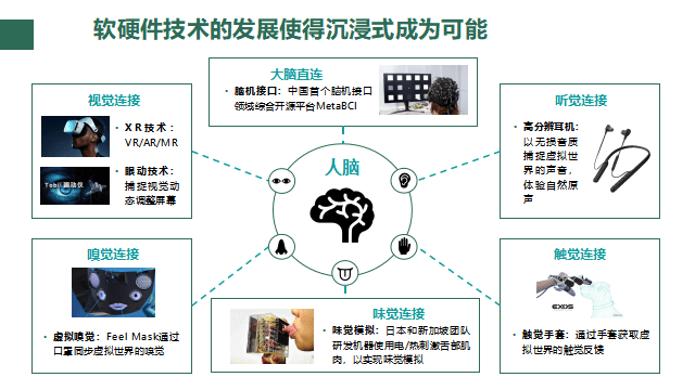 当前科学家和企业家正在往这个方向前进。在触觉链接方面,Meta提出了触觉手套,可在虚拟的空间里感受真实的触觉。嗅觉方面,当我们的口罩变得智能化,同样它也可以把味道通过不同化学物质去传递。听觉方面,达到耳机无损音质,可以通过模拟人体左耳与右耳听力技术来实现。各种模拟的实现,不仅仅体现在元宇宙的沟通方式,同样也可能提升相关障碍人群的社交参与度。