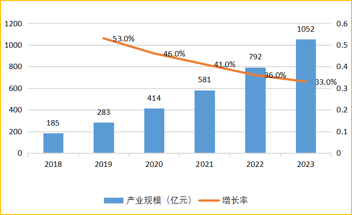 2018-2023年中国VR/AR产业规模及增长情况(单位:亿元)