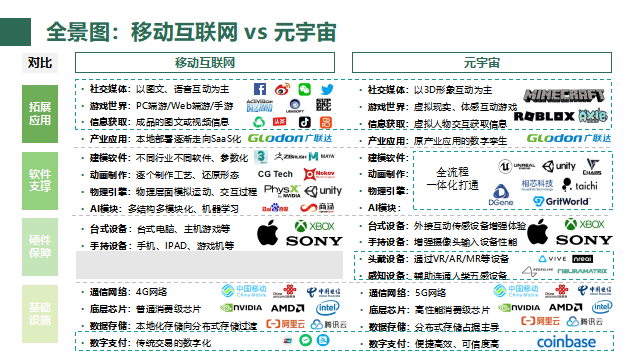 讲完了“想象”,杜雨从基础设施、硬件、软件和拓展应用四个层面,把移动互联网赛道与元宇宙赛道进行对比,分享了元宇宙科技公司和科学家们目前的“现实”。