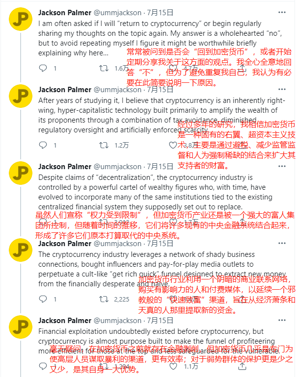 具体而言,Jackson Palmer将加密货币定义为“一种天生的右翼、超资本主义的技术,主要是通过避税、减少监管和人为强制的稀缺性来扩大其支持者的财富。”