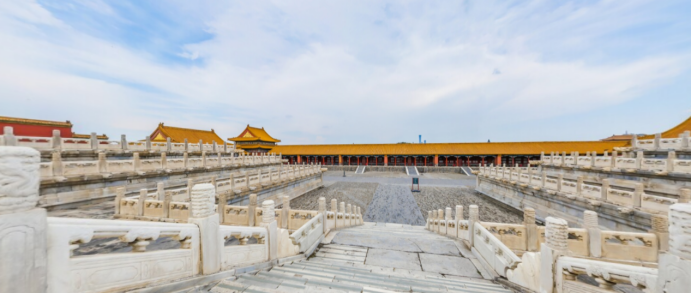 速途元宇宙研究院体验到“全景故宫”的VR项目,在手机或VR头显中能够看到故宫的全景复刻,通过操作手柄或者手机能够360度转变视角,看到整个宫殿的环境,仿佛“我”真的“置身其中”,在画面的左上角能够看到“我”处的位置,并且能够点击地图上的小红点,“穿越”到不同的位置,去“看见”不一样的风景。
