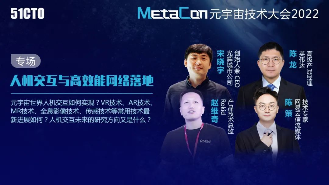 人机对话交互一直是人工智能的重要应用场景,那么VR/AR/MR虚拟现实技术、全息影像技术、传感技术等常用技术最新进展如何?超低延迟传输网络架构在元宇宙场景如何应用?在《人机交互与高效能网络落地》专场中,各位嘉宾对此进行了分享。