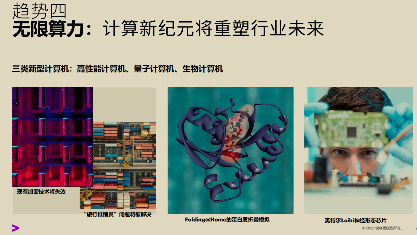 二是目前火热的量子计算,各个国家都在投入去研究,但眼下能投入到商业世界里产生商业价值的案例并不多,还需要一些在技术科学上取得突破的地方。三是生物计算芯片,以前是电子元器件搭成的计算系统,以及图灵计算机的架构。但到生物计算时将突破这个架构,通过神经元进行搭建。