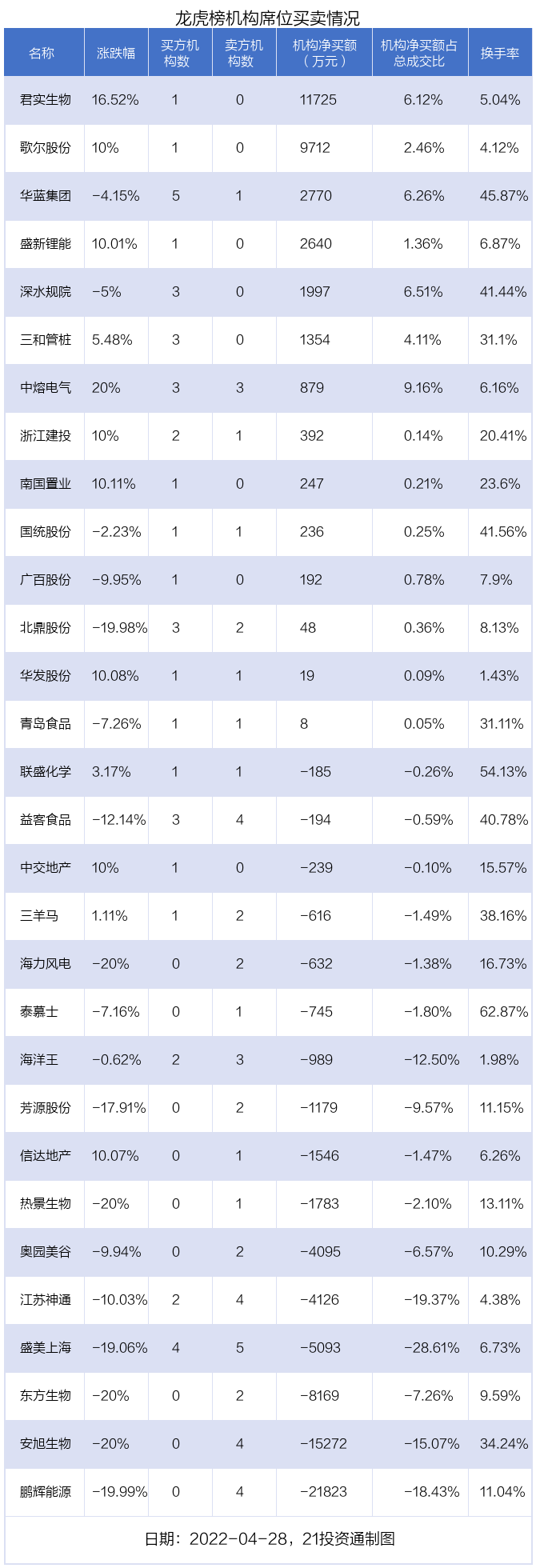 4月28日,30只个股龙虎榜出现了机构的身影,机构合计净卖出3.45亿元。具体来看,机构净买入14股,净卖出16股。