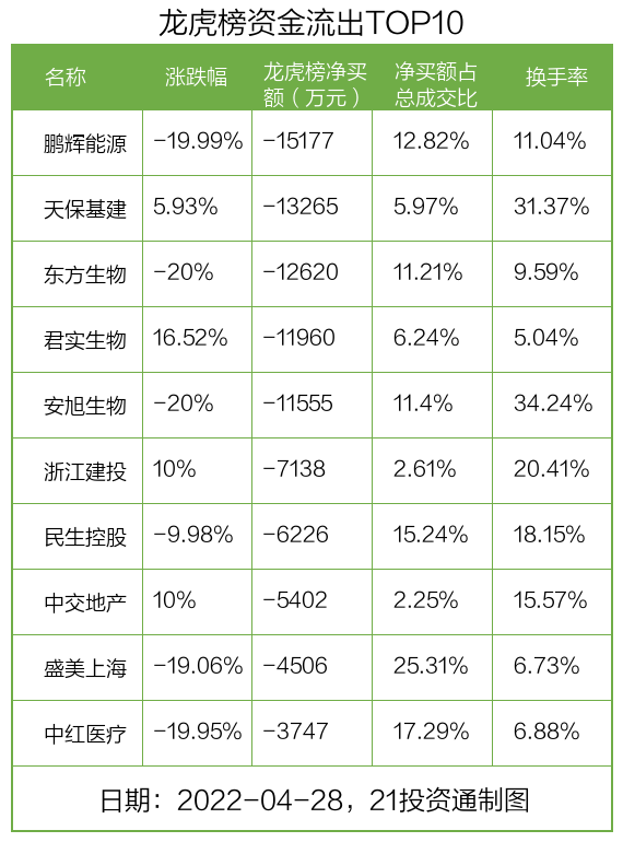 而龙虎榜中资金净流出最多的是鹏辉能源(300438.SZ),被净卖出为1.52亿元,占总成交金额的12.82%。鹏辉能源收盘下跌19.99%,换手率为11.04%。