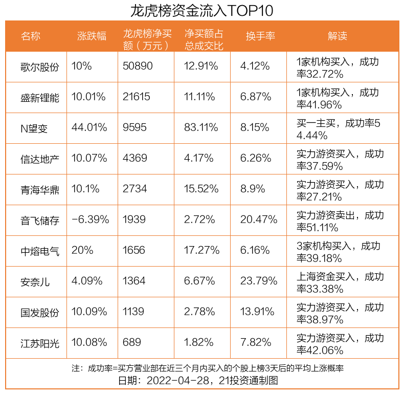 4月28日,上证指数上涨0.58%,深证成指下跌0.23%,创业板指下跌1.83%。盘后龙虎榜数据显示,共有62只个股因当日异动登上龙虎榜,资金净流入最多的是歌尔股份(002241.SZ),达5.09亿元。