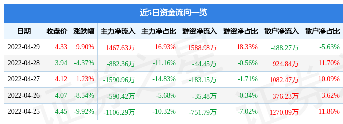 资金流向数据方面,4月29日主力资金净流入1467.63万元,游资资金净流入1588.98万元,散户资金净流出488.27万元。