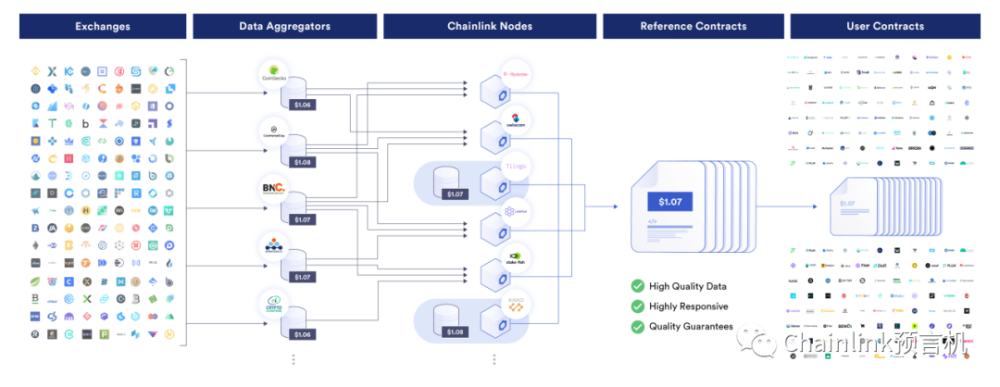 Chainlink在数据源、节点和预言机网络的多层聚合策略可以确保Chainlink Price Feed每次更新时都能准确反映资产价格,并充分覆盖所有市场。